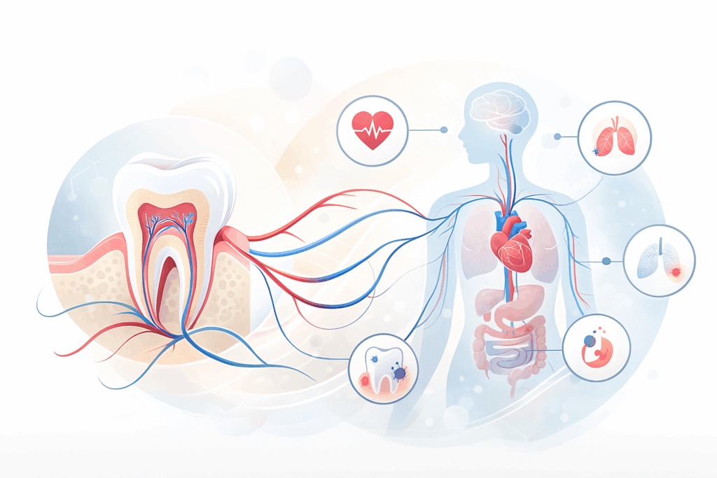 歯周病は「歯だけの病気」ではなく、放置すると糖尿病・心血管疾患・誤嚥性肺炎・早産など、全身の健康にも影響することがわかっています。